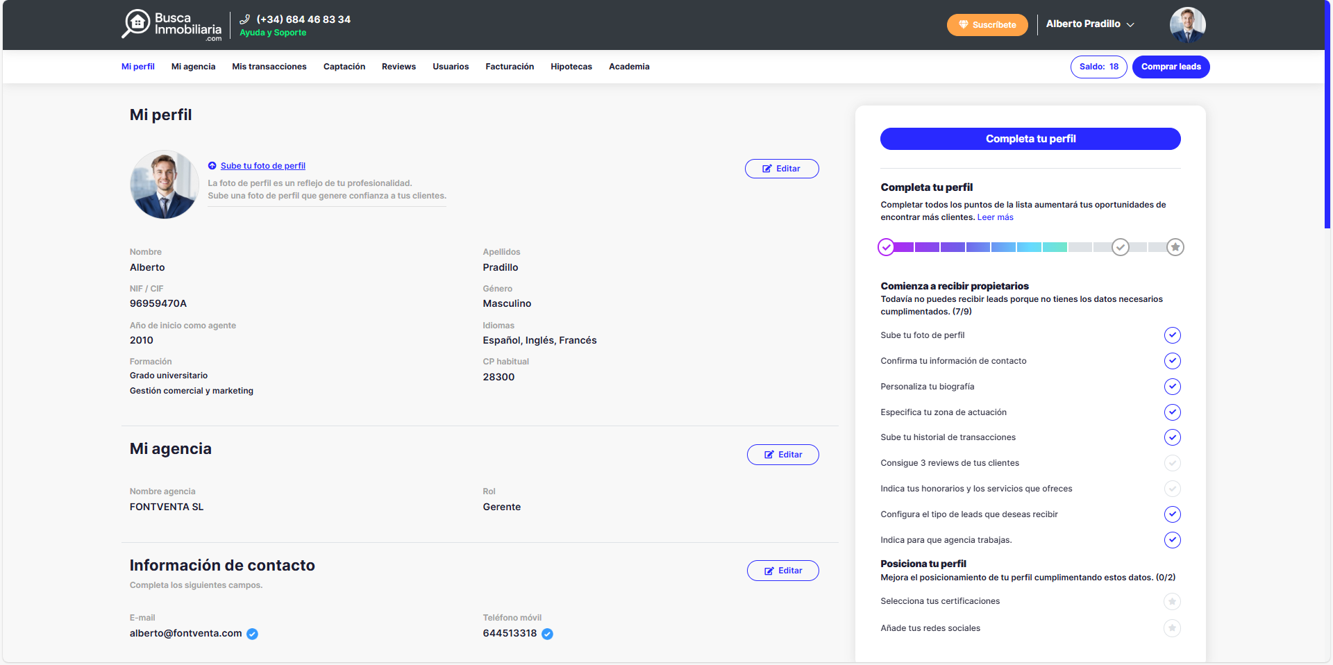 Crear tu perfil como Agencia o Agente Inmobiliario tiene un coste de 49,90€ + Iva. La suscripción incluye la visibilidad de tu Agencia Inmobiliaria, los Agentes de tu Equipo, datos de contacto, tus transacciones vendidas o alquiladas, tu página web y una descripción de tu experiencia como Agencia y Agente. Ademas deberás pagar por cada propietario cualificado por nuestro equipo que desee trabajar contigo y que te haya seleccionado previamente, cada contacto de Propietario tiene un coste de 69,90€ + Iva. Para más información sobre nuestras tarifas puedes llamar al 667660468.
