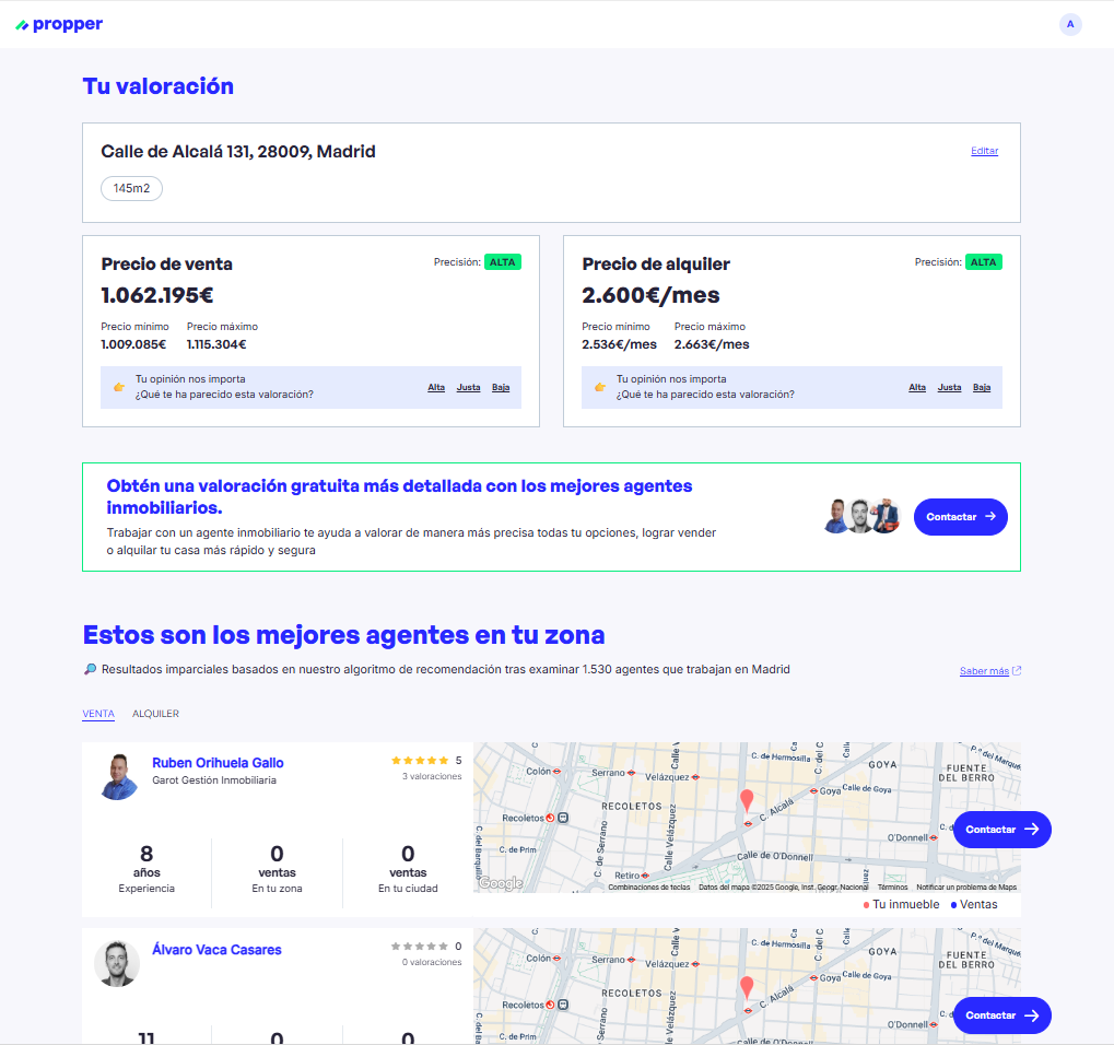 Para recomendar a un agente inmobiliario tenemos en cuenta las ventas que ha realizado los últimos 6 meses y las reseñas de otros propietarios. Además, tenemos en cuenta el tipo de servicios y propiedades que suele trabajar el agente inmobiliario para ofrecer al propietario una mejor experiencia.